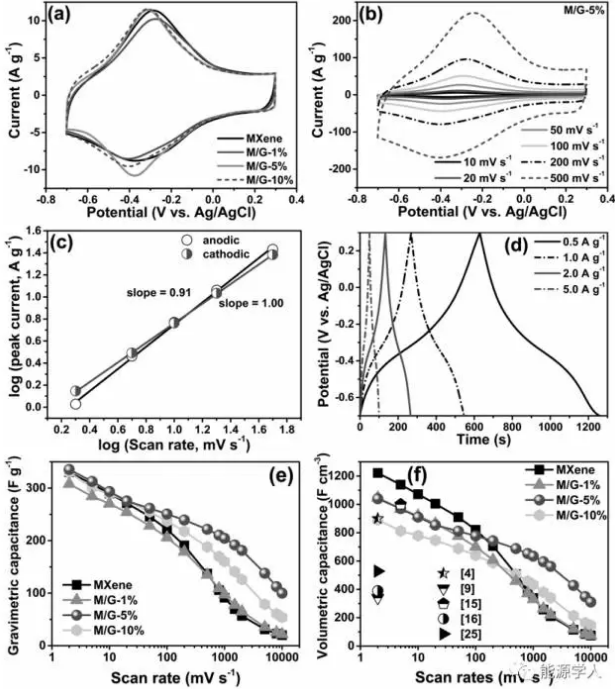圖2(a)在3MH2SO4電解質(zhì)中,掃速為20mV/s時(shí),MXene和MXene/rGO的CV圖;(b)M/G-5%電極在不同掃速下的CV圖;(c)M/G-5%電極的峰值電流與掃描速率(2-50mV/s)之間的關(guān)系圖;(d)M/G-5%電極在不同電流密度下的充放電曲線圖;(e-f)MXene和MXene/rGO電極在不同掃速下的質(zhì)量比電容和體積比電容圖。