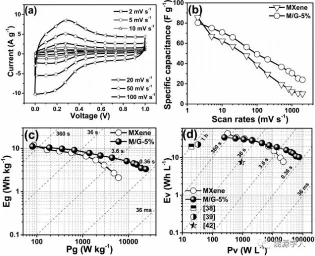 圖3MXene和M/G-5%電極在對稱超級電容器中不同掃速下的(a)CV圖;(b)質(zhì)量比電容圖;MXene和M/G-5%電極在對稱超級電容器中(c)質(zhì)量;(d)體積能量和功率密度圖。